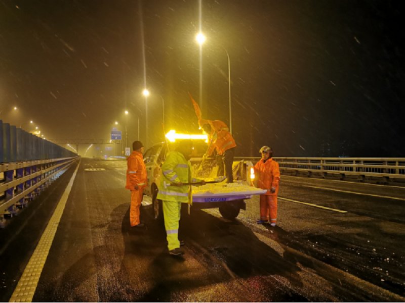 28日夜間,隨著雪勢的增大,監(jiān)控中心密切關注天氣變化情況,及時發(fā)布路況信息,第一時間通報路面積雪情況,并用擴音設備提醒過往車輛謹慎駕駛,減速慢行。路巡組增加道路巡查頻次,對轄區(qū)路段加強警戒,保障清雪作業(yè)路段道路安全暢通。同時,除雪組及時組織力量對積雪結冰路段實施融雪除冰處置措施,全力開展除雪保通工作,針對易打滑、陡坡、急彎、伸縮縫等特殊路段進行拋灑融雪劑,引導車輛緩慢通行,全力以赴除雪保通。